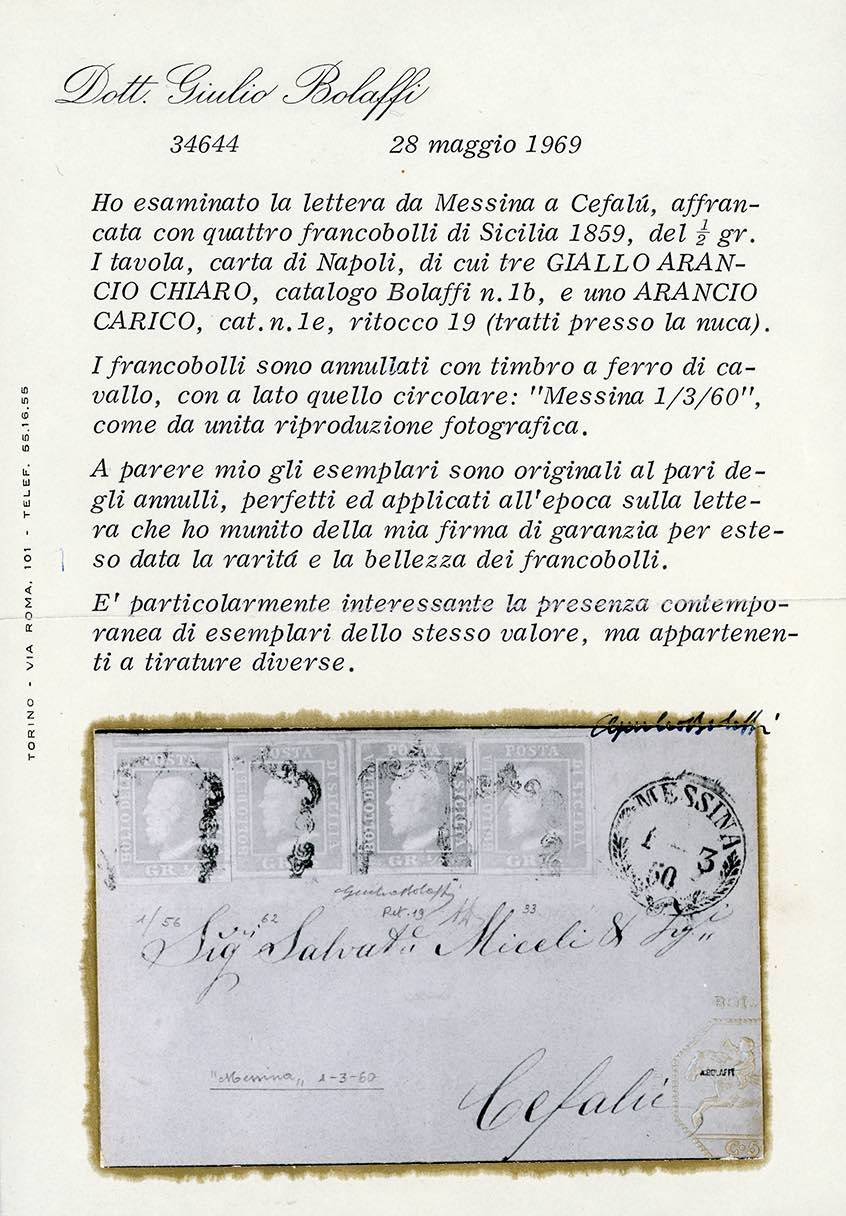 1860 - 1/2 grano, tinta intermedia tra l'arancio scuro e l'arancio carico, I tavola, ritocco pos. 19, 1/2 grano giallo arancio chiaro, I tavola, tre esemplari, tutti carta di Napoli (1e/f,1aa), perfetti e ben marginati, su fresca sovracoperta di lettera da Messina 1/3/1860 a Cefalù. Splendida e rarissima. Valore di catalogo astronomico. Cert. Giulio Bolaffi per esteso.
