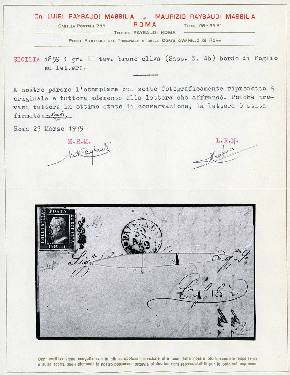 1859 - 1 grano bruno oliva, II tavola (4b), bordo di foglio in basso, perfetto, isolato su lettera di mezzo foglio da Palermo 30/4/1859 per Cefalù, indirizzo parzialmente ritagliato. Uso isolato e tariffa molto rara. A.Diena, cert. Raybaudi.
