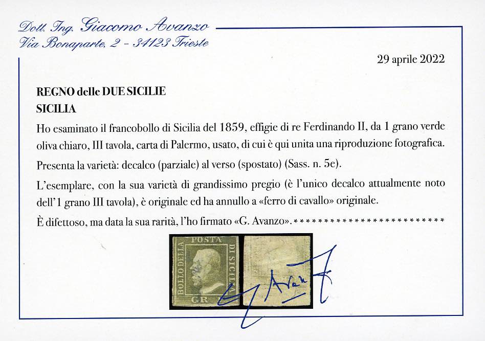 1859 - 1 grano verde oliva chiaro, III tavola, DECALCO parziale spostato al verso (5e), usato, margine superiore intaccato. UNICO ESEMPLARE FINORA NOTO DI QUESTA VARIETa'. Cert. Avanzo.