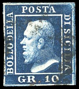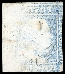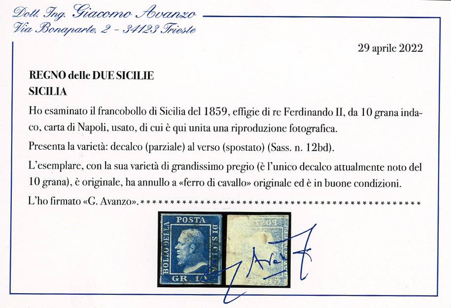 1859 - 10 grana indaco, DECALCO parziale spostato al verso (12bd), usato, ottimo stato. UNICO ESEMPLARE NOTO di questa varietà finora inedita. Cert. Avanzo.