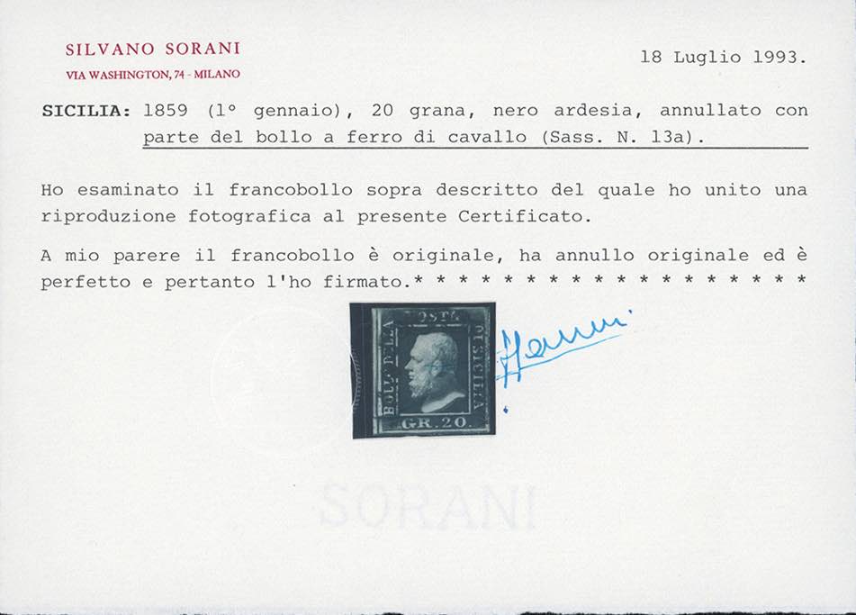 Lot 789 - 1859 - 20 grana nero ardesia (13a), usato, perfetto. Cert. ...