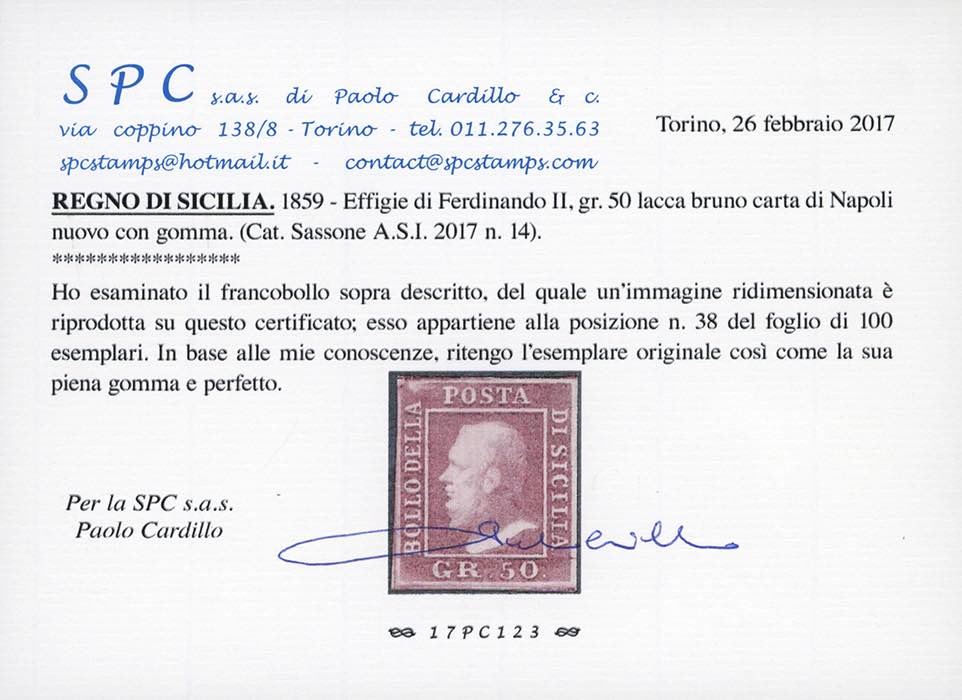 1859 - 50 grana lacca bruno (14), gomma originale, perfetto. Cert. Cardillo.