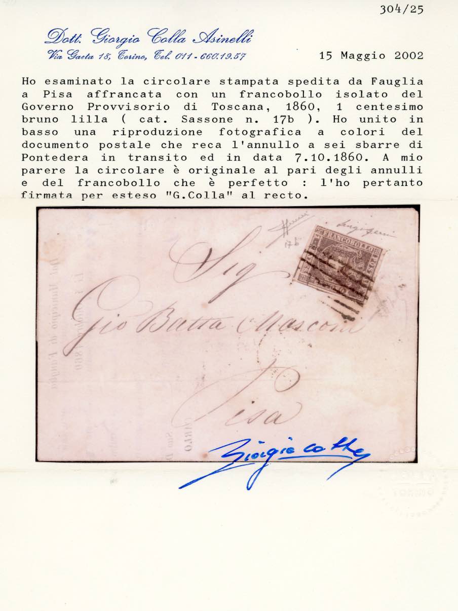 1860 - 1 cent. bruno lilla (17b), perfetto, isolato su circolare a stampa da Fauglia a Pisa 7/10/1860. Raro uso isolato su circolare, di ottima qualità. Sorani, cert. Colla.