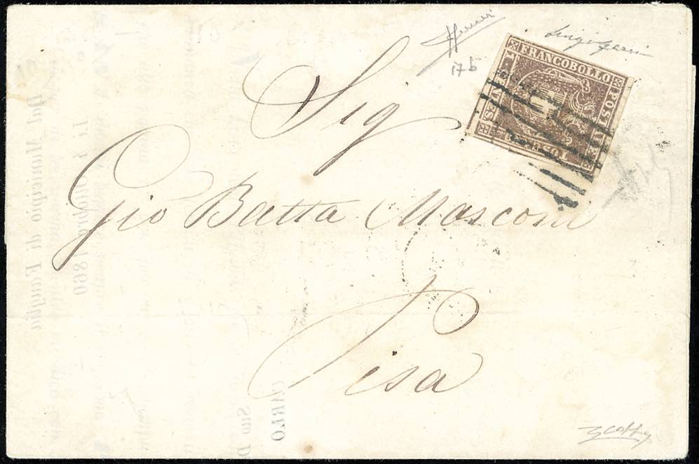 1860 - 1 cent. bruno lilla (17b), perfetto, isolato su circolare a stampa da Fauglia a Pisa 7/10/1860. Raro uso isolato su circolare, di ... Read more