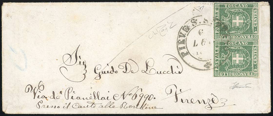 1861 - 5 cent. verde (18), coppia orizzontale, perfetta, su busta da Pieve S.Stefano 6/7/1861 a Firenze. Molto bella. E.Diena, cert. ... Read more