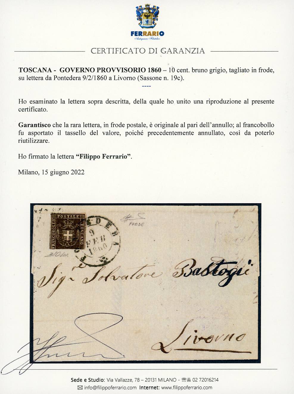 1860 - 10 cent. bruno grigio (19c), parte inferiore del francobollo con il tassello del valore completamente asportata, tre ampi margini bianchi sugli altri lati, su lettera da Pontedera 9/2/1860 a Livorno. Interessante e rara FRODE POSTALE, con l'asportazione della porzione precedentemente annullata del francobollo. Cert. Ferrario e Oliva.
