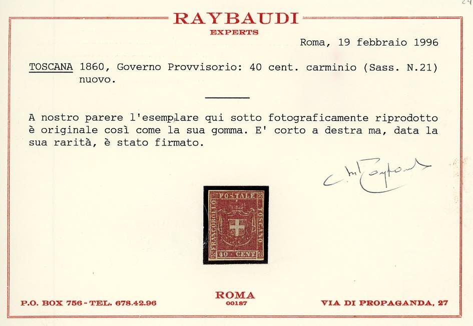 1860 - 40 cent. carminio (21), gomma originale, intaccato a destra. Raro, occasione! Cert. Raybaudi.
