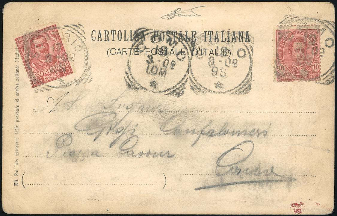 1902 - 10 cent. Umberto I (60), su cartolina da Como 13/8/1902 a Sondrio, riaffrancata con 10 cent. Floreale (71), e rispedita cancellando ... Read more