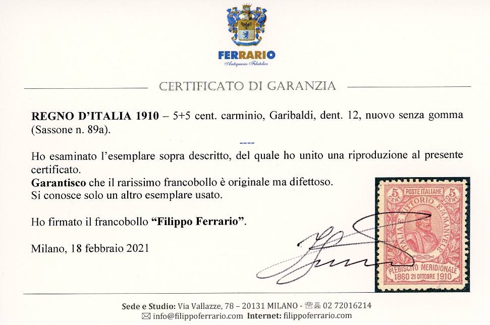 1910 - 5 + 5 cent. Garibaldi, dent. 12 (89a), nuovo senza gomma, difettoso. Si tratta dell'UNICO ESEMPLARE NOTO allo stato di nuovo di ... Read more