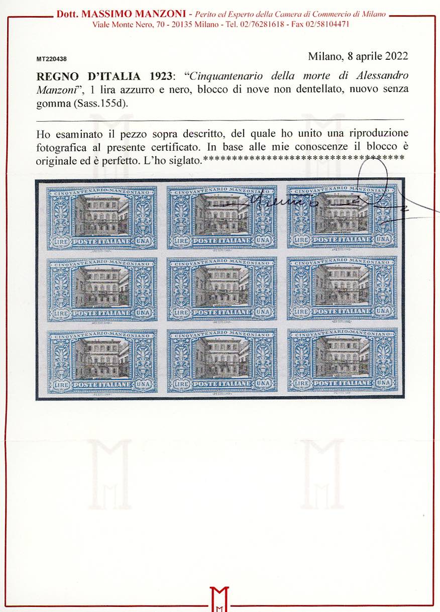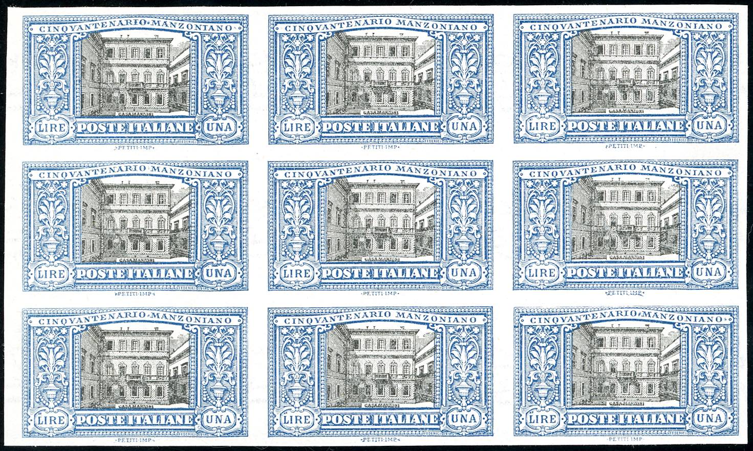1923 - 1 lira Manzoni, non dentellato (155d), blocco di 9, nuovo senza gomma, perfetto. Bello. Cert. Manzoni.