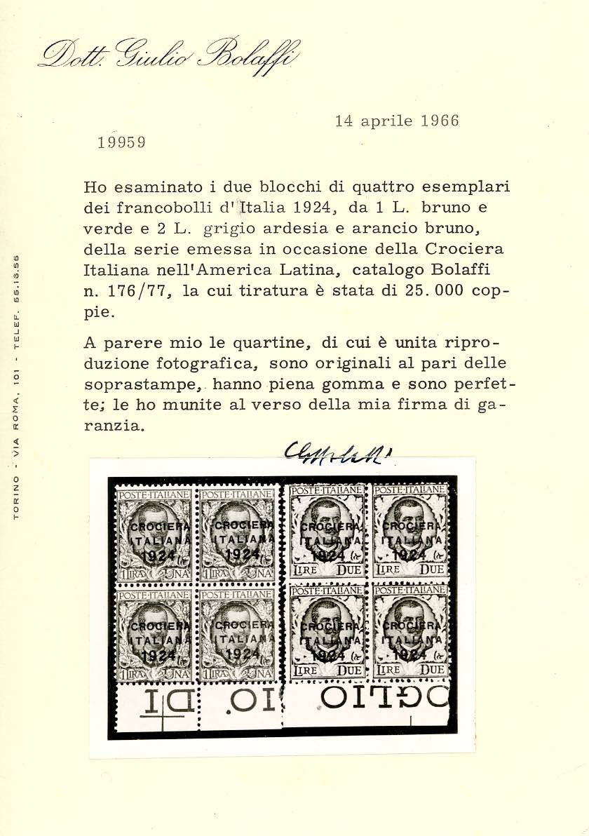 1924 - Crociera Italiana, serie completa (162/168), blocchi di quattro, bordo di foglio, gomma originale integra, perfetti. Cert. G.Bolaffi per i due alti valori.