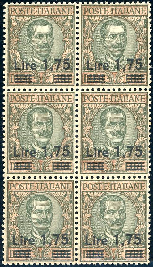 1925 - 1,75 lire su 10 lire Floreale (182), ottima centratura, blocco di sei, gomma originale integra, perfetto. Molto bello. Ferrario.