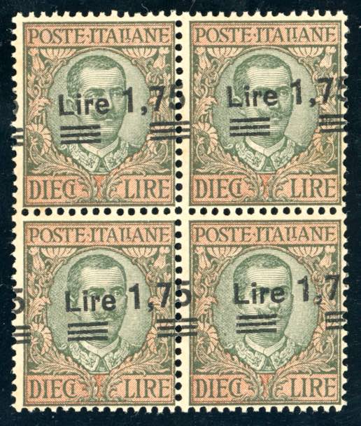 1924 - 1,75 lire su 10 lire, soprastampa fortemente spostata in alto e a destra (182gc), blocco di quattro, gomma originale integra, perfetto.