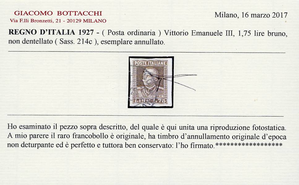 1927 - 1,75 lire Parmeggiani, non dentellato (214c), usato, perfetto. Bello e raro. A.Diena, cert. Bottacchi.