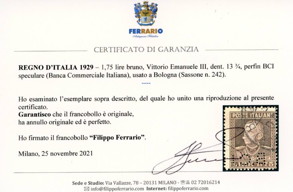 1929 - 1,75 lire bruno, dent. 13 3/4 (242), perfin BCI speculare, perfetto, usato a Bologna. Chiavarello, cert. Ferrario.