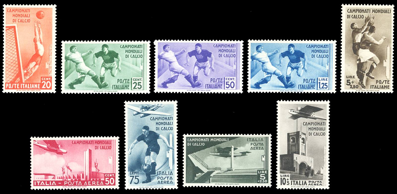 1934 - Mondiali di calcio, serie completa (357/361+A), gomma originale integra, perfetti. Ottima qualità. Ferrario.