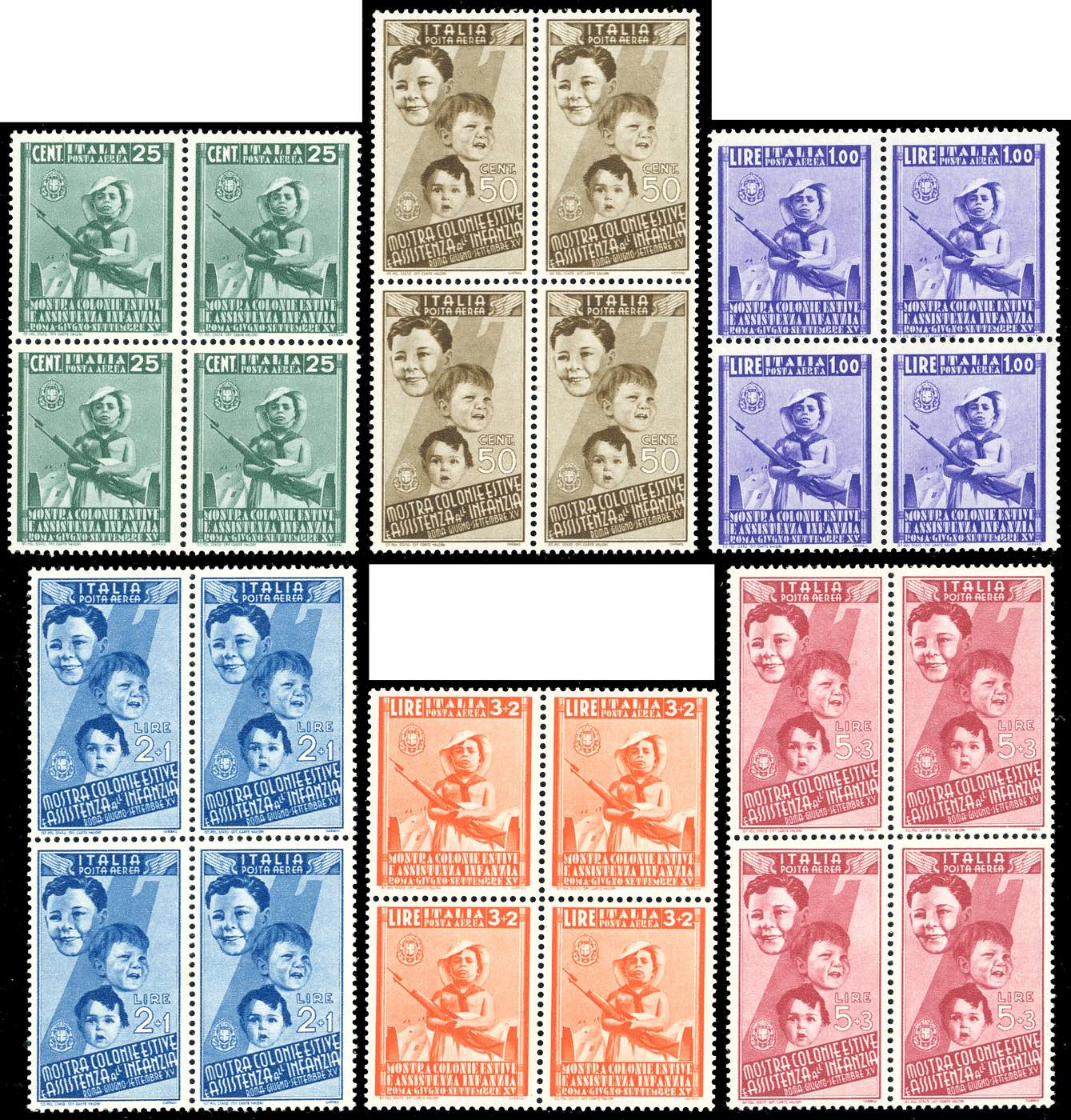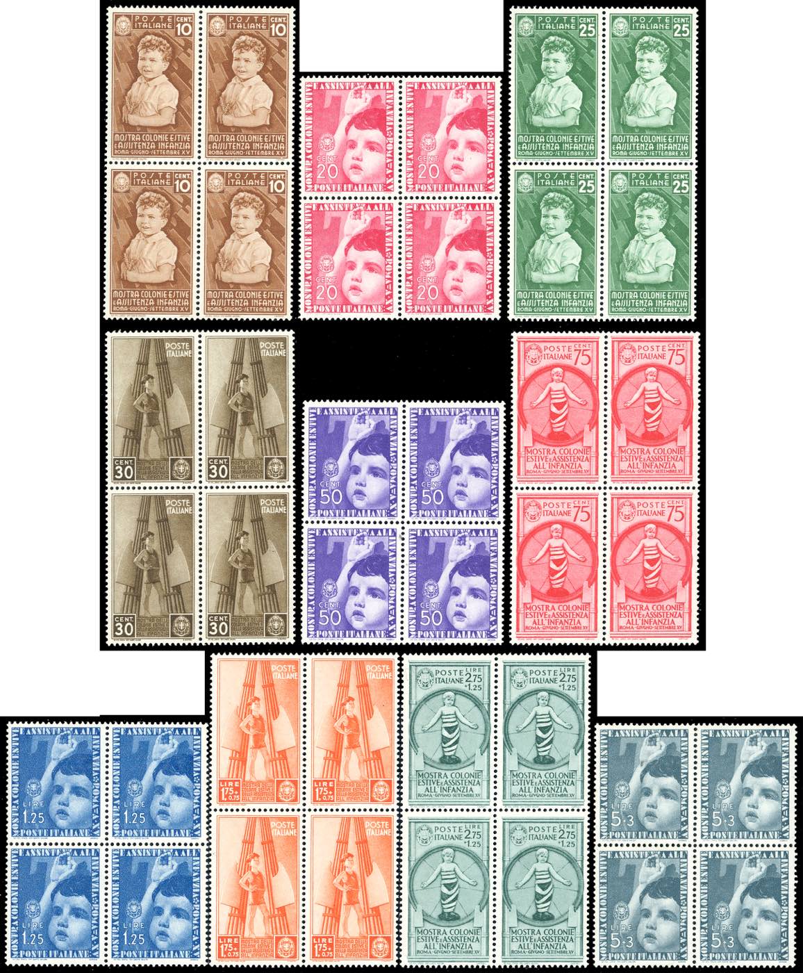 1937 - Colonie estive, serie completa (406/415+A), blocchi di quattro, gomma originale integra, perfetti. Bellissimi.