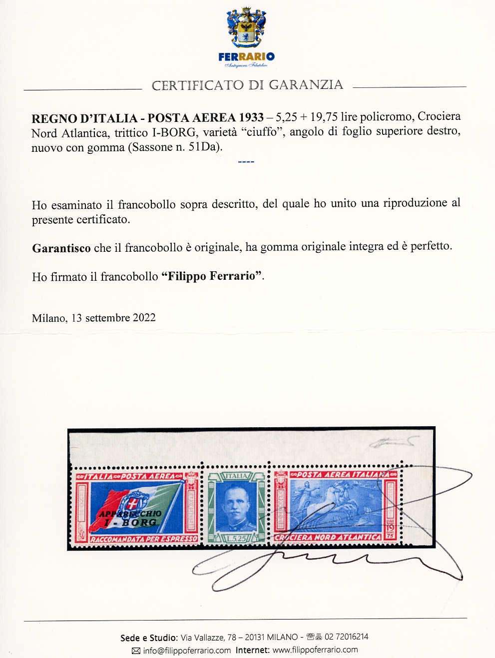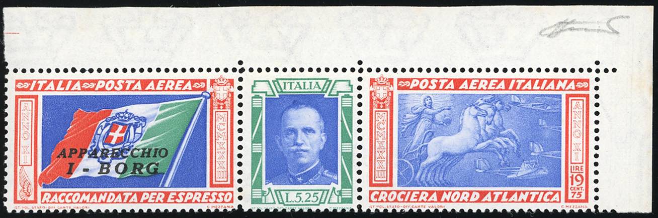 1933 - 5,25 + 19,75 lire Trittico I-BORG, varietà "ciuffo" (51Da), angolo di foglio, gomma originale integra, perfetto. Molto bello. G.Bolaffi, cert. Ferrario.