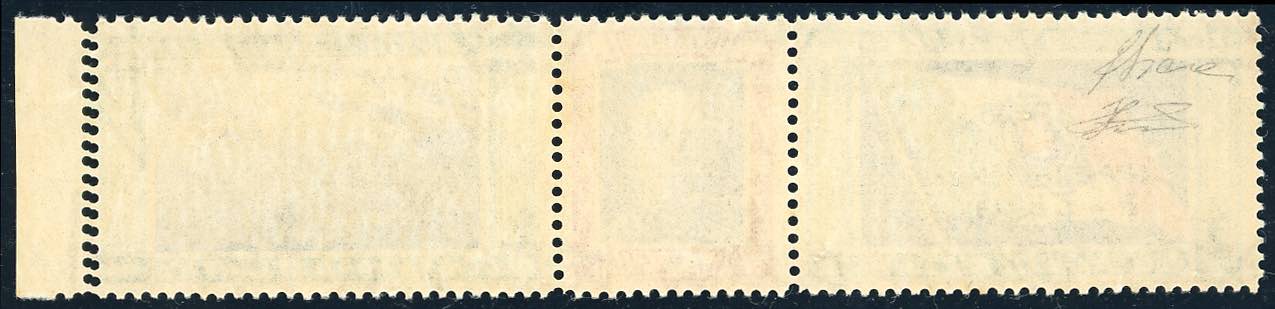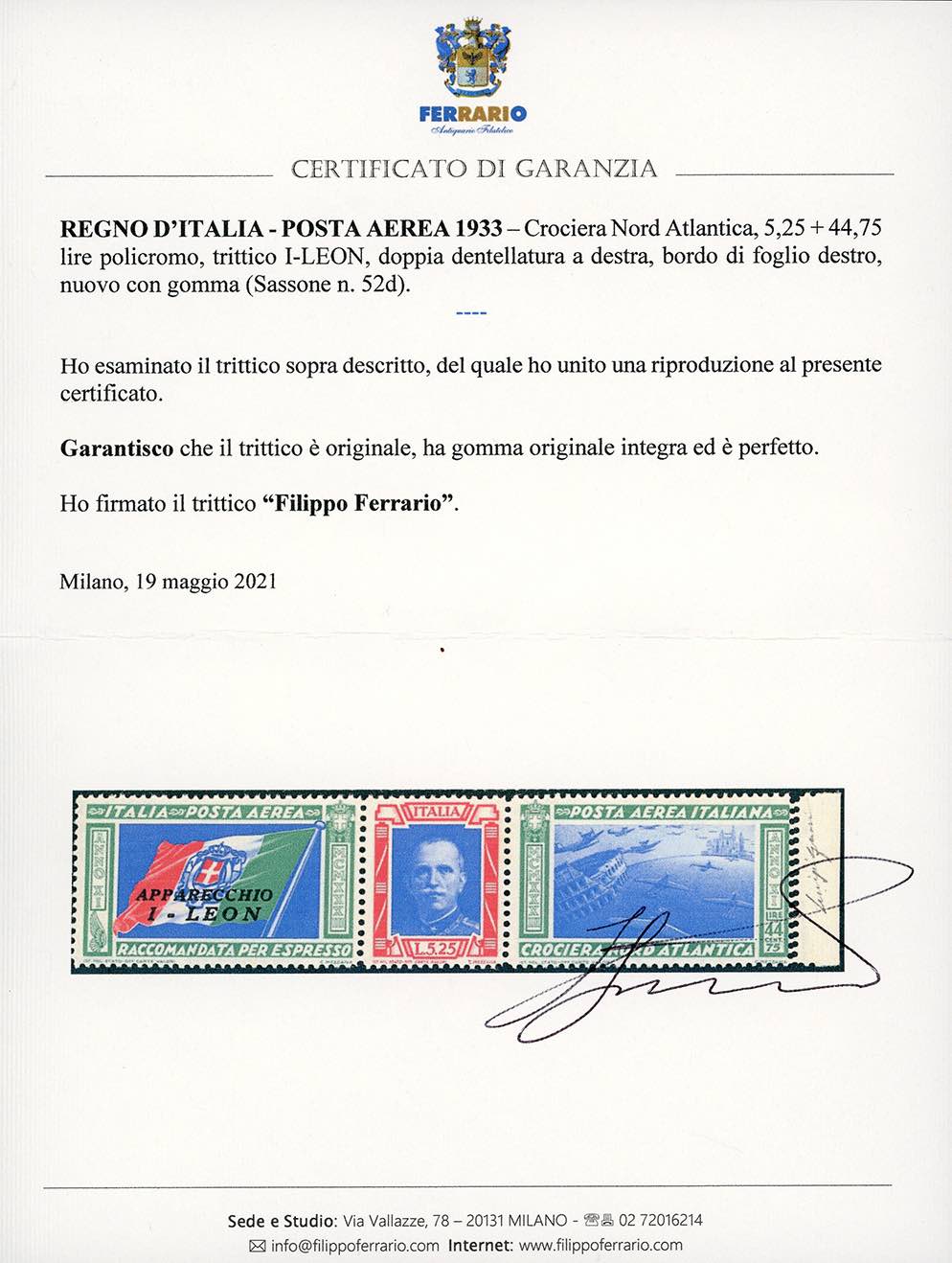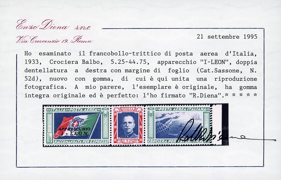 1933 - 5,25 + 44,75 lire Trittico I-LEON, doppia dentellatura a destra (52d), bordo di foglio, gomma originale integra, perfetto. Raro, 20 esemplari noti, di cui solo due con questa sigla. Cert. Diena e Ferrario.