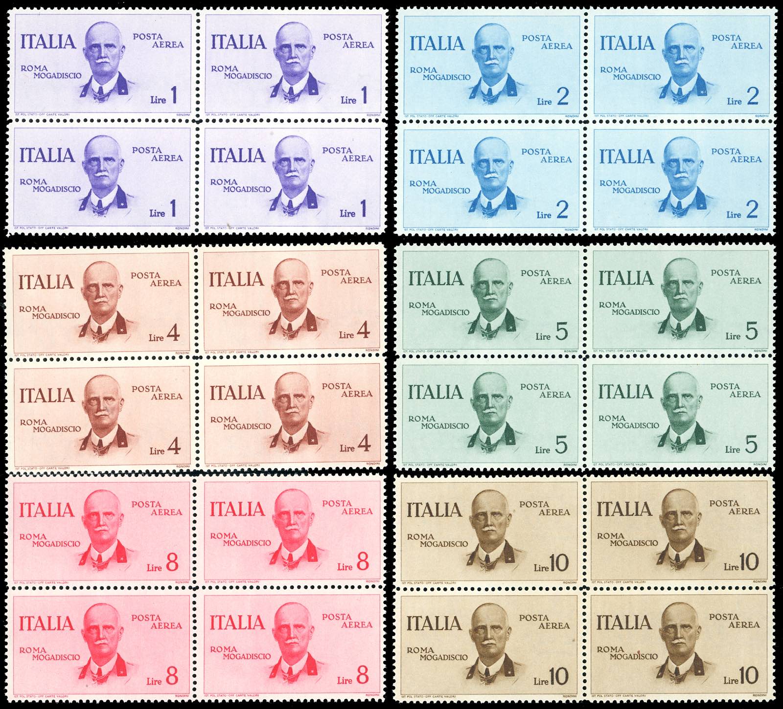 1934 - Volo Roma - Mogadiscio, serie completa (83/88), blocchi di quattro, gomma originale integra, perfetti.
