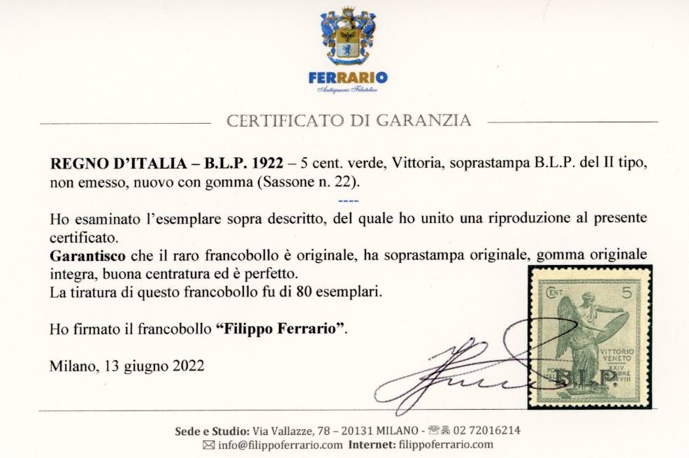 1922 - 5 cent. Vittoria, soprastampa B.L.P. del II tipo, non emesso (22), gomma originale integra, perfetto e ben centrato. Molto fresco e raro, tiratura 80 esemplari. Fotocopia cert. Sorani della serie di provenienza, cert. Ferrario.