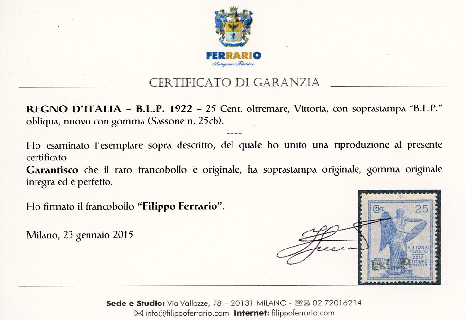 1922 - 25 cent. Vittoria, soprastampa BLP obliqua (25cb), gomma originale integra, perfetto. Fresco e rarissimo. Sorani. Cert. Ferrario.