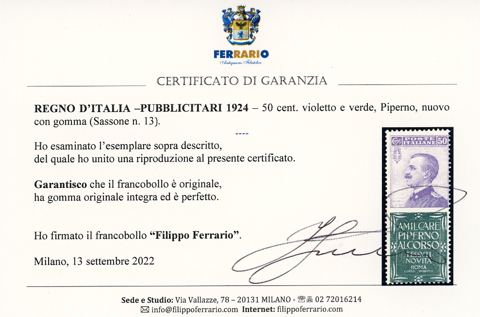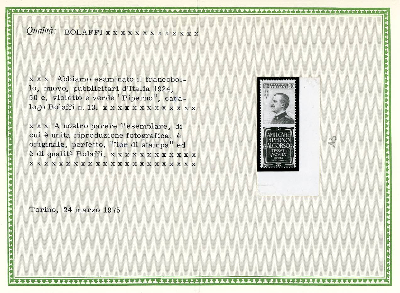 1924 - 50 cent. Piperno (13), gomma originale integra, perfetto. Cert. Bolaffi e Ferrario.