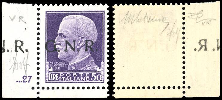1944 - 50 lire soprastampa di Verona, angolo di foglio con soprastampa ripetuta, decalco della soprastampa solo sul bordo e numero di cilindro (489kb), gomma originale integra, perfetto. Raro. Cert. Carraro e Wolf.