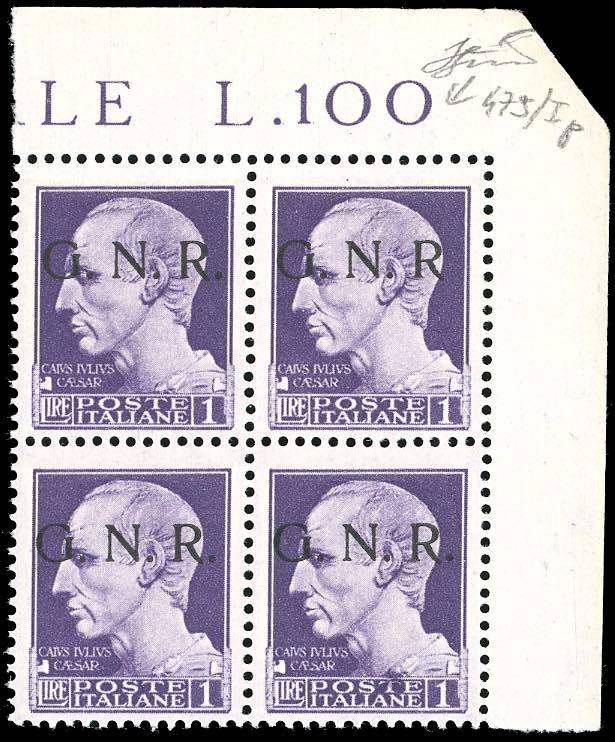 1943 - 2 lira soprastampa G.N.R. di Brescia, I tipo, blocco di 4, un esemplare senza punto dopo R (476/I,476/Ip), angolo di foglio, gomma originale integra, perfetto. Ferrario.