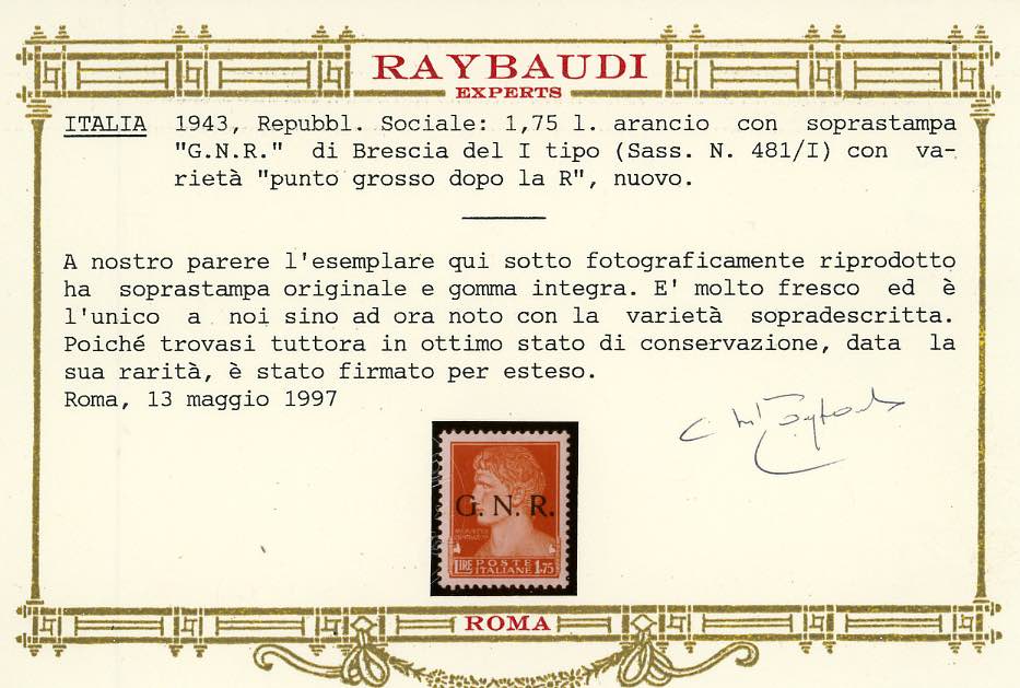 1943 - 1,75 lire soprastampa G.N.R. di Brescia, I tipo, punto grosso dopo la R (481/Ipc),gomma originale integra, perfetto. UNICO ESEMPLARE NOTO, rarità assoluta del settore. Sorani, Chiavarello, cert. Oro Rabaudi,