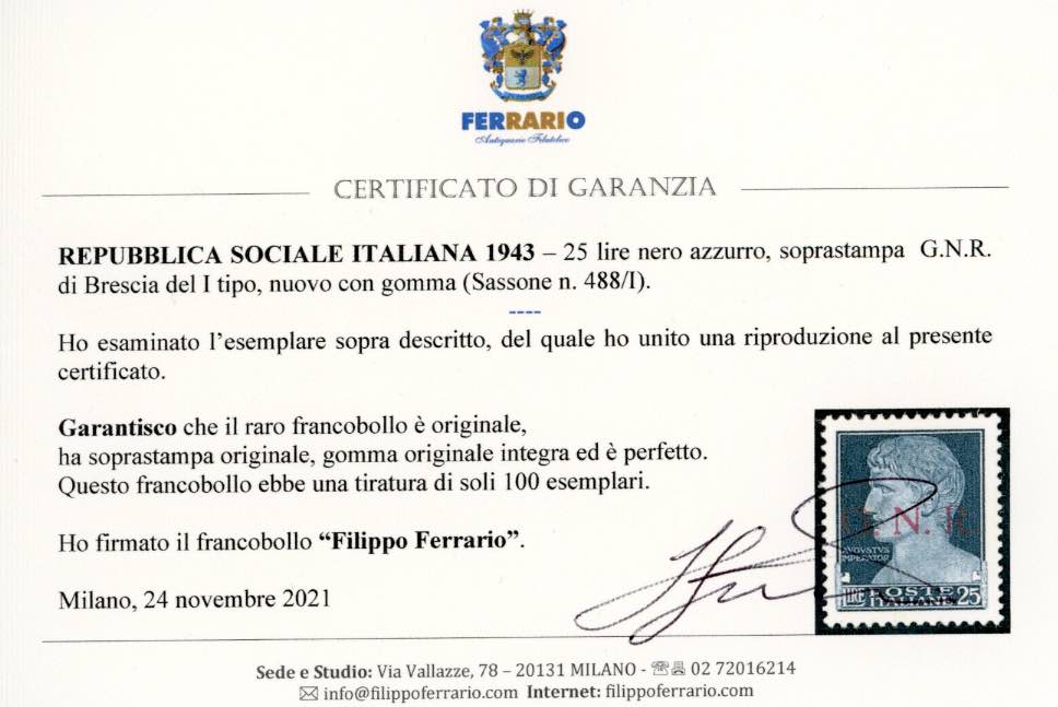 1943 - 25 lire nero azzurro, soprastampa G.N.R. di Brescia del I tipo (488/I), nuovo, gomma originale integra, perfetto. Molto fresco e ... Read more