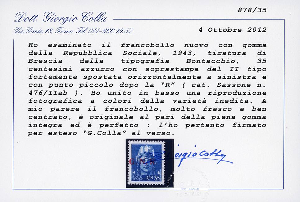 1943 - 35 cent. soprastampa G.N.R. di Brescia, II tipo, fortemente spostata a sinistra e punto piccolo dopo la R (476/IIab), gomma ... Read more