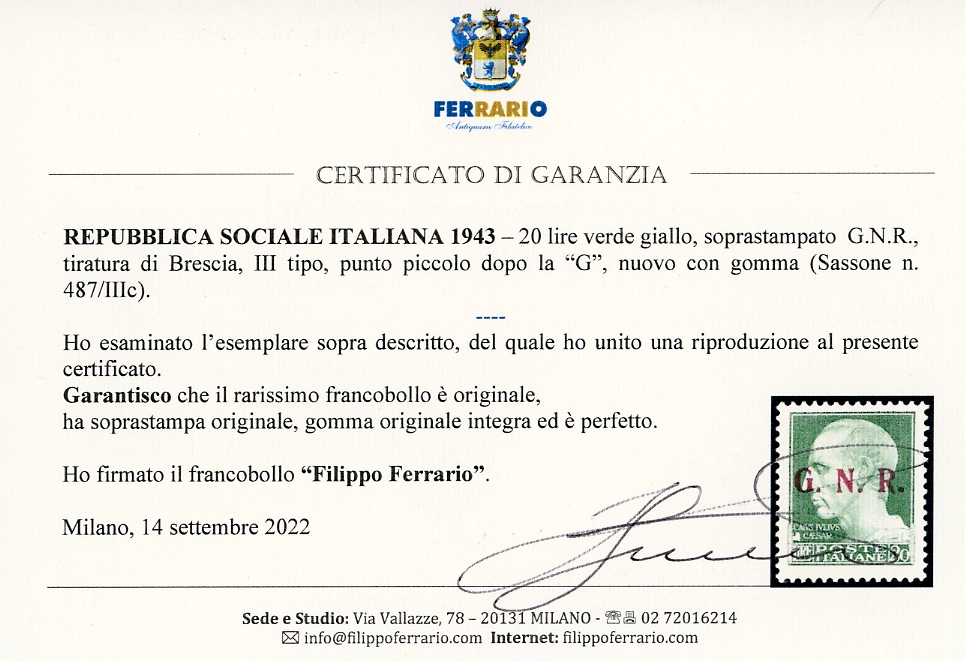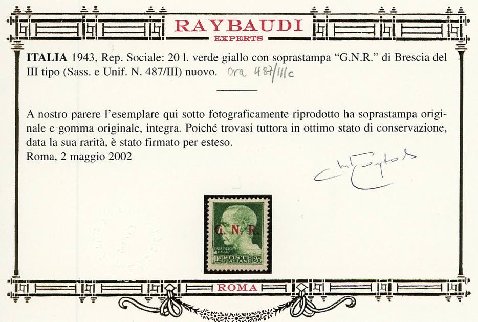 1943 - 20 lire soprastampa G.N.R. di Brescia, III tipo, punto piccolo dopo la G (487/IIIc), gomma originale integra, perfetto. Estremamente raro. Cert. Oro Raybaudi e Ferrario.