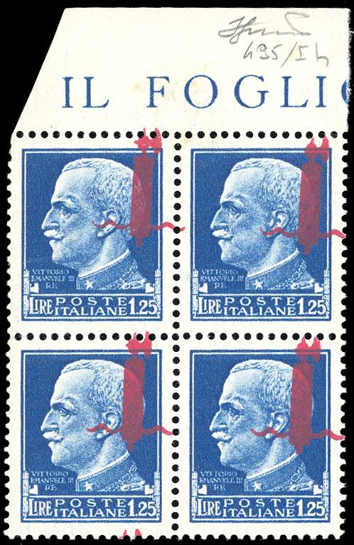 1944 - 1,25 lire, blocco di quattro soprastampa obliqua in carminio lillaceo, tiratura di Firenze (495/Ih), nuovo, gomma originale integra, ... Read more