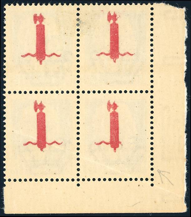 1944 - 1,25 lire blocco di quattro, tiratura di Firenze, soprastampa rossa, posiz. 80,81,91 e 92 (495/II), con l'esemplare alla posizione 91 con nastro del fascio mancante a sinistra, gomma originale per i due esemplari superiori e integra per quelli inferiori, perfetto. Inoltre presenta decalco della soprastampa al verso. Insieme raro. Ferrario.
