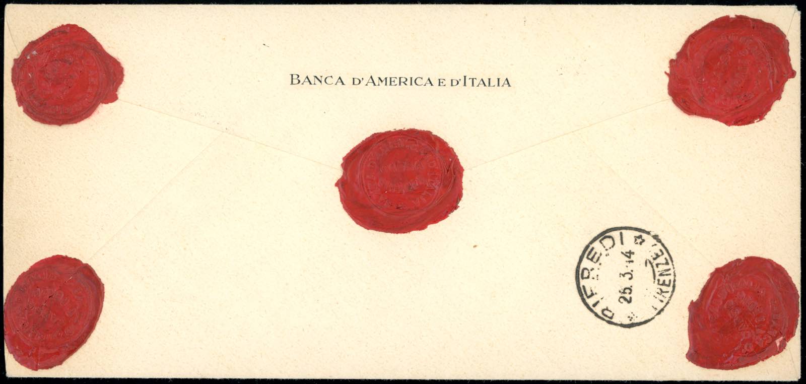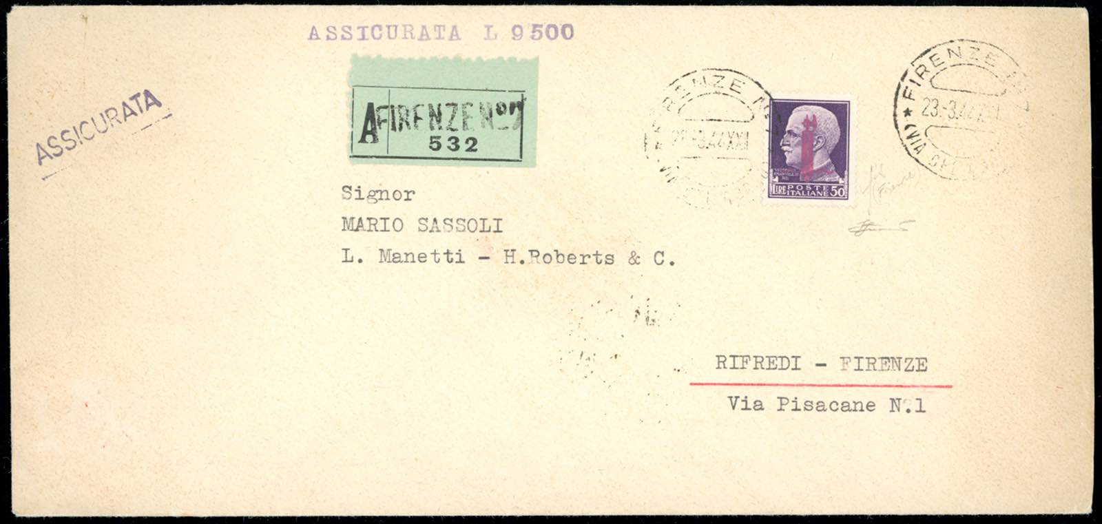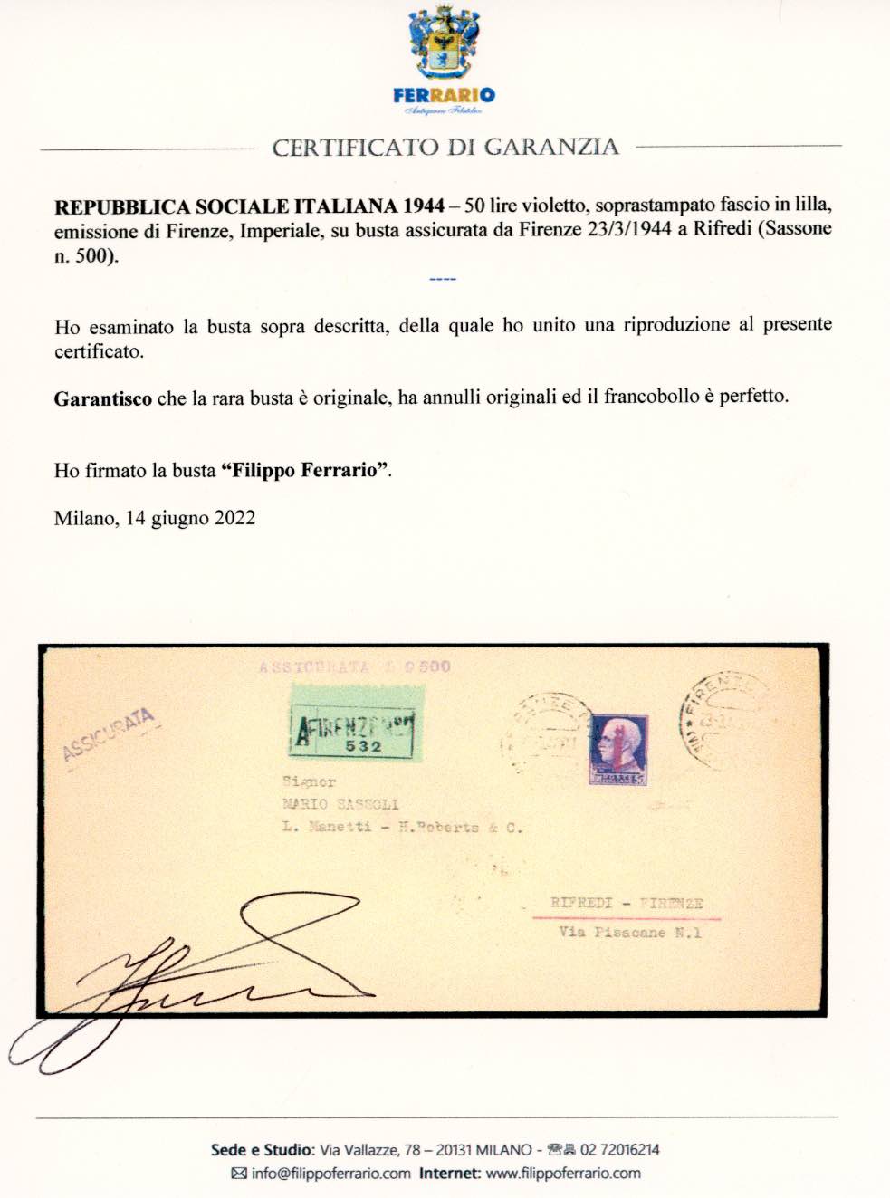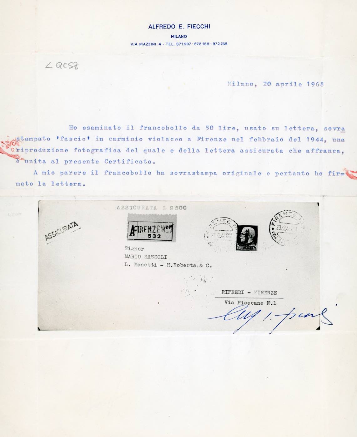 1944 - 50 lire soprastampato fascio in lilla, emissione di Firenze (500), perfetto, su busta assicurata da Firenze 23/3/1944 a Rifredi. Rara e molto bella. Cert. Fiecchi e Ferrario.