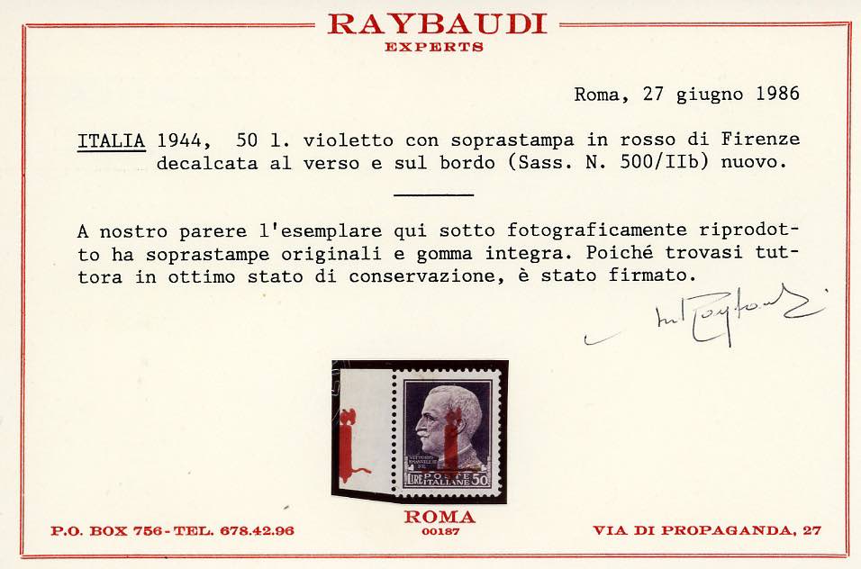 1944 - 50 lire soprastampato fascio in rosso, tiratura di Firenze, bordo di foglio a sinistra con la soprastampa ripetuta, decalco di entrambe le soprastampe al verso (500/Iib), gomma originale integra, perfetto. Solo 10 esemplari noti. Uno dei francobolli più rari di tutta la Repubblica Sociale. Cert. Raybaudi e Ferrario.