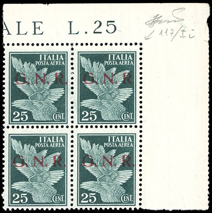 1943 - 25 cent. soprastampa G.N.R. di Brescia, I tipo, blocco di quattro, un esemplare senza punto dopo la R (117/I,117/Ii), angolo di ... Read more