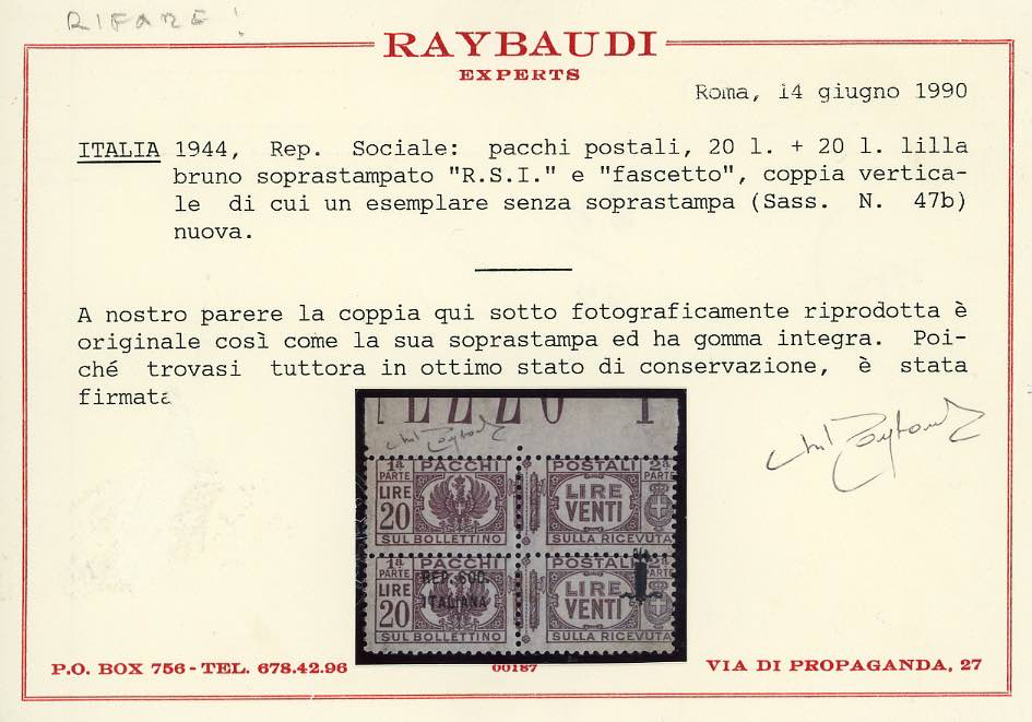 1944 - 20 lire, coppia verticale, il primo esemplare senza soprastampa, il secondo con soprastampa di 36 mm. (47da), gomma originale integra, perfetta. Rarissima, DUE SOLE COPPIE NOTE. Cert. Oro Raybaudi.