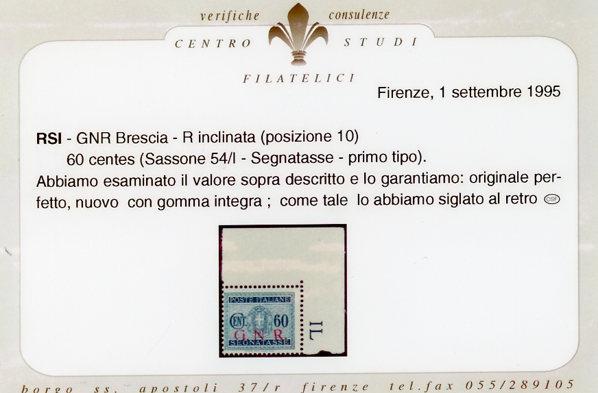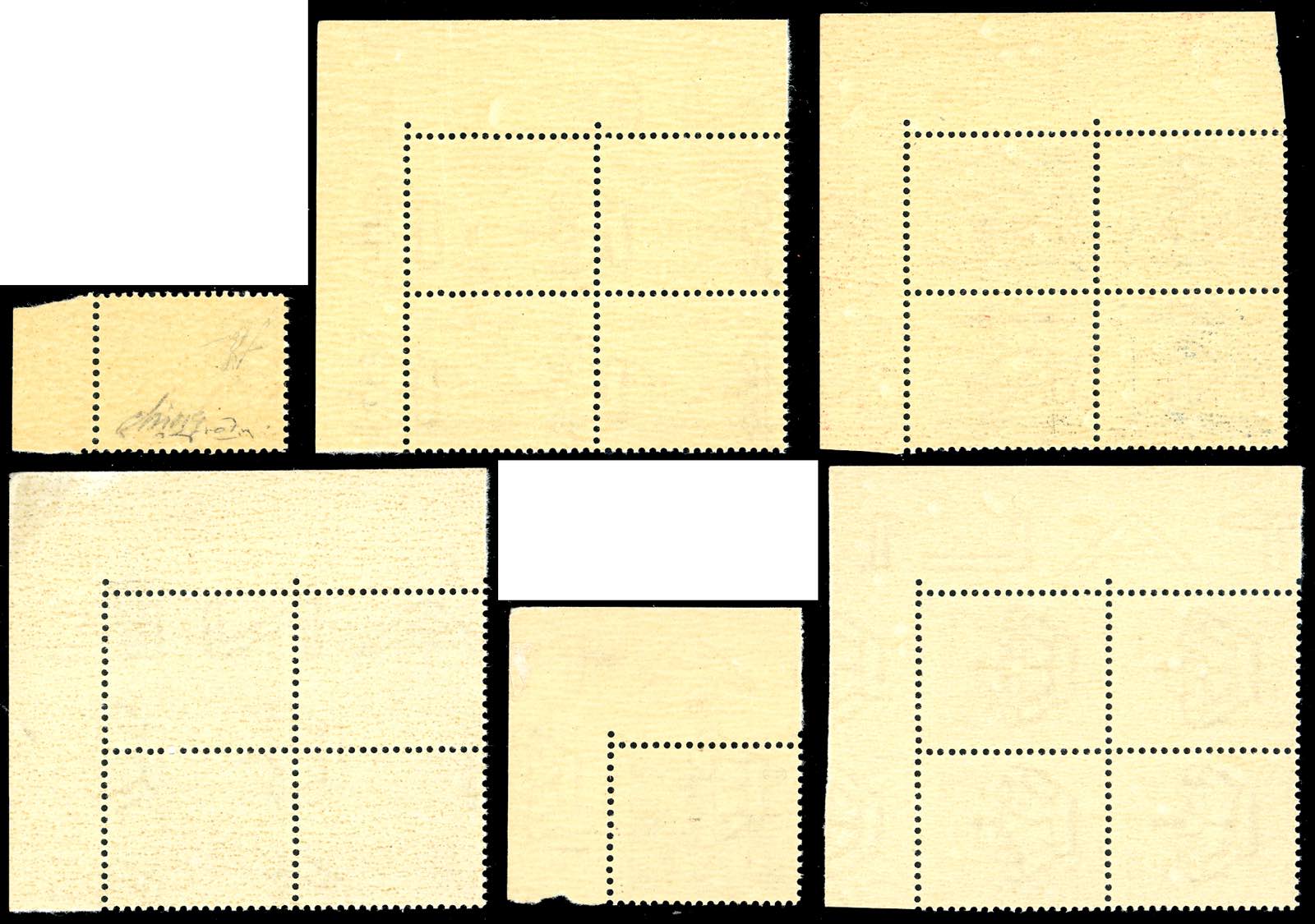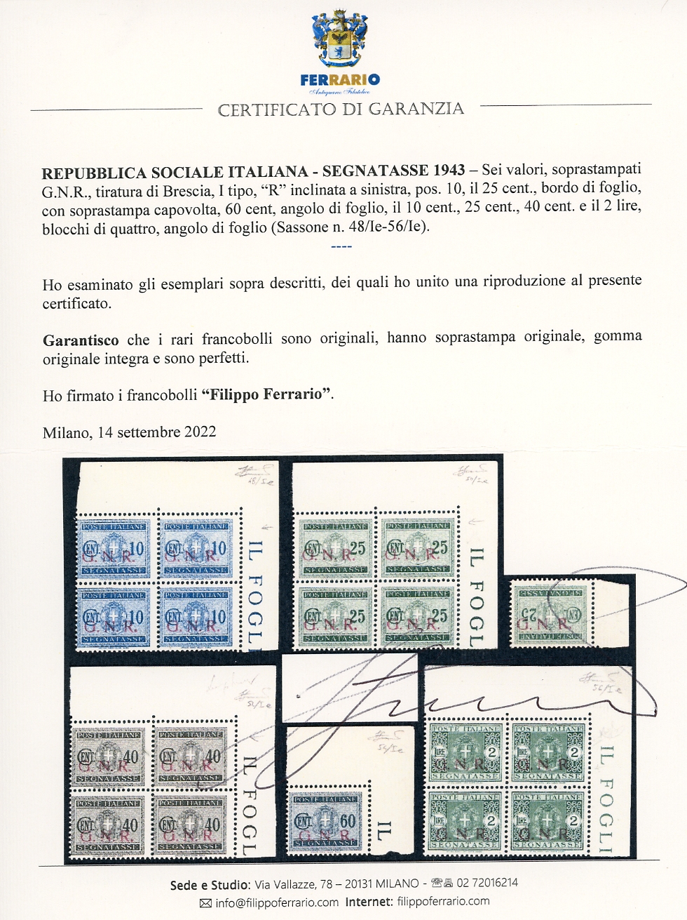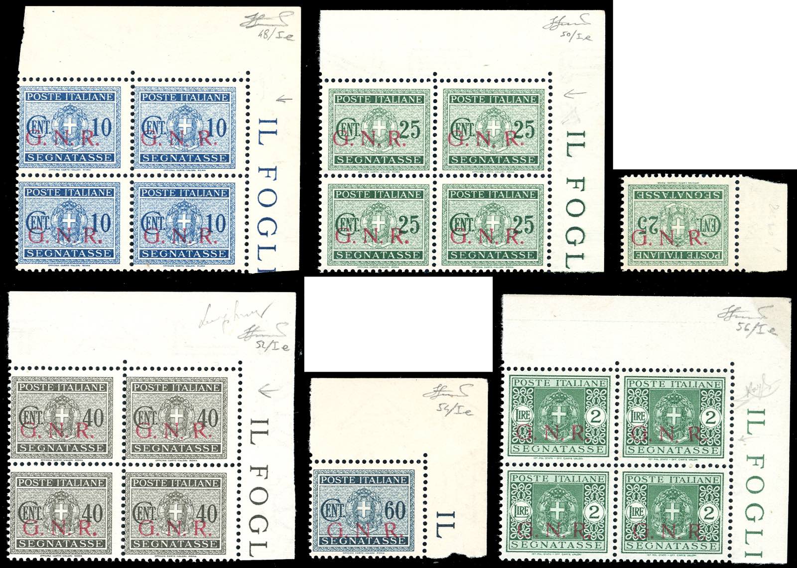 1943 - Soprastampati G.N.R. di Brescia, I tipo, R inclinata a sinistra, pos. 10, i sei valori noti (48/Ie-56/Ie), blocchi di quattro, angolo di foglio per il 10 cent. 25 cent., 40 cent., 2 lire, gomma originale integra, perfetti. Insieme rarissimo. Cert. Oro Raybaudi per il raro 25 cent. con soprastampa capovolta (tiratura cinque esemplari), cert. Ferrario per tutti.