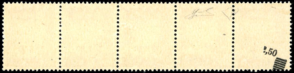 1945 - 2,50 lire su 1,75 lire Imperiale, striscia orizzontale di cinque, il primo esemplare senza soprastampa al recto e solo parziale al ... Read more