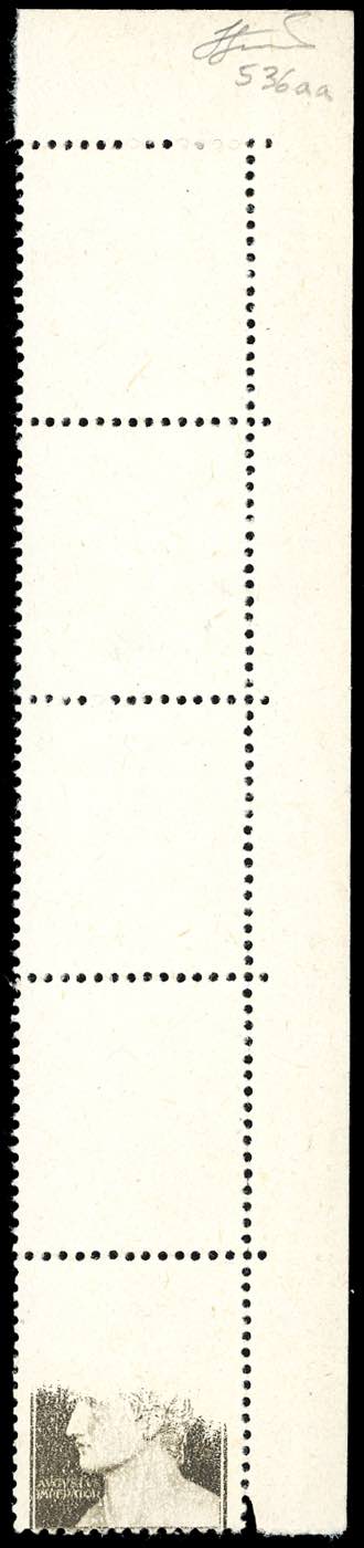 1945 - 10 cent., emissione di Novara, striscia verticale di 5, i primi 4 esemplari con stampa totalmente mancante, l'ultimo con stampa incompleta (536aa,536a), angolo di foglio, gomma originale integra, perfetto. Bella varietà, d'effetto. Ferrario.
