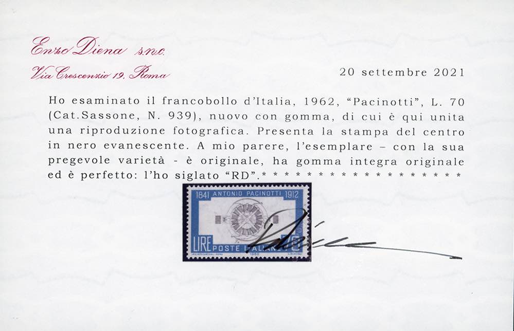 1962 - 70 lire Pacinotti, un esemplare con stampa del centro evanescente, uno con la stampa del centro spostata (939a,939b), gomma originale integra, perfetti. Cert. Diena per il primo.