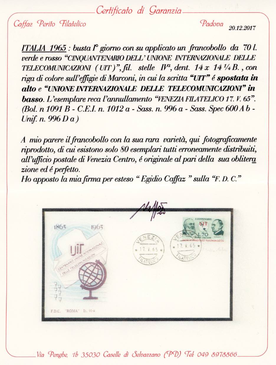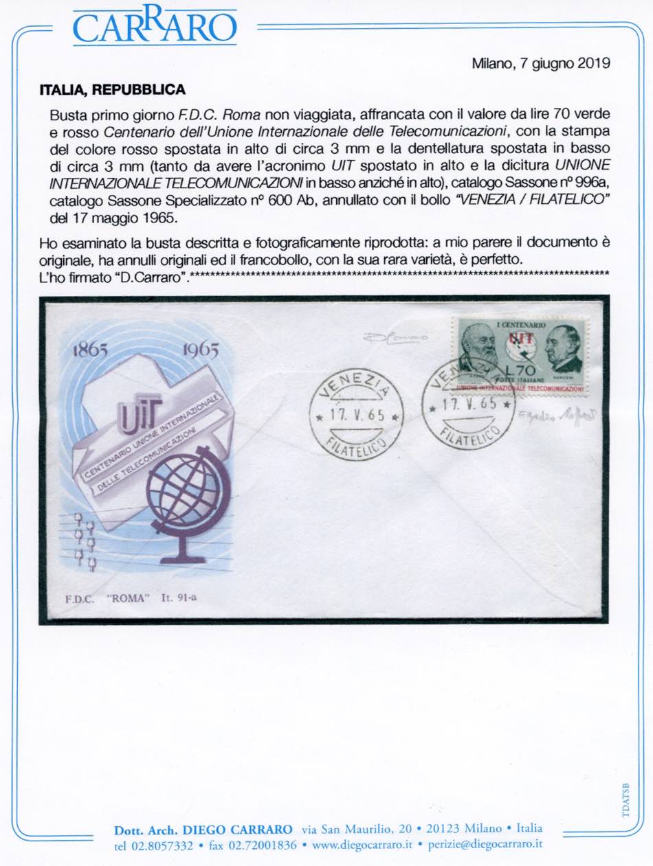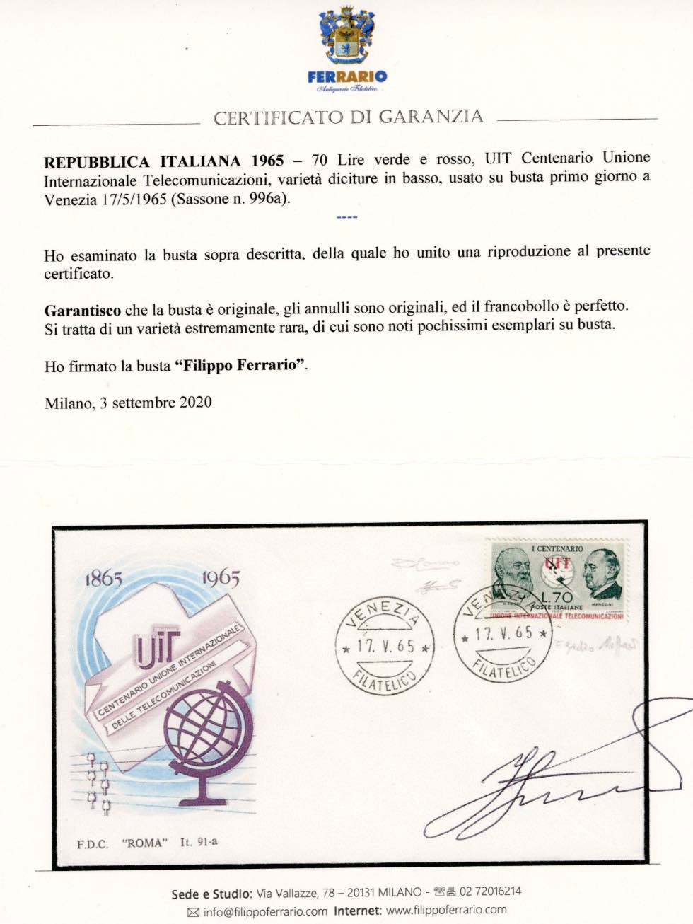 1965 - 70 lire Centenario UIT, varietà diciture in basso (996a), perfetto, usato su busta primo giorno a Venezia 17/5/1965. Insieme splendido ed estremamente raro, in quanto questa varietà ebbe una tiratura di soli 80 esemplari, dei quali pochissimi conosciuti su lettera. Rarità. Cert. Carraro, Caffaz e Ferrario (cat. Sassone € 25.000 per l'usato).