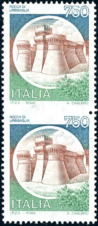 1990 - 750 lire Castelli (1524A), coppia verticale con dentellatura cieca al centro, gomma originale integra, perfetta.