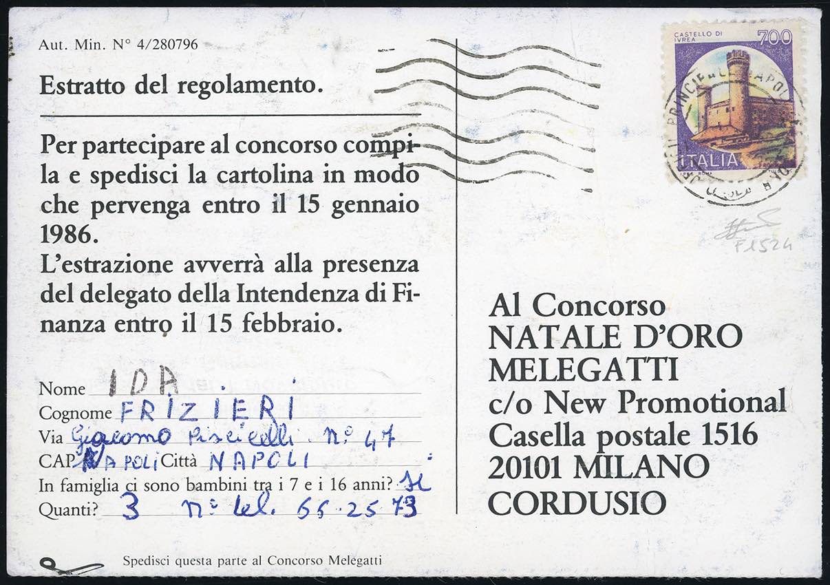 1985 - 700 lire Castelli, falso per posta di Napoli (F1524), perfetto, su cartolina concorso da Napoli dicembre 1985 a Milano. Raro. ... Read more