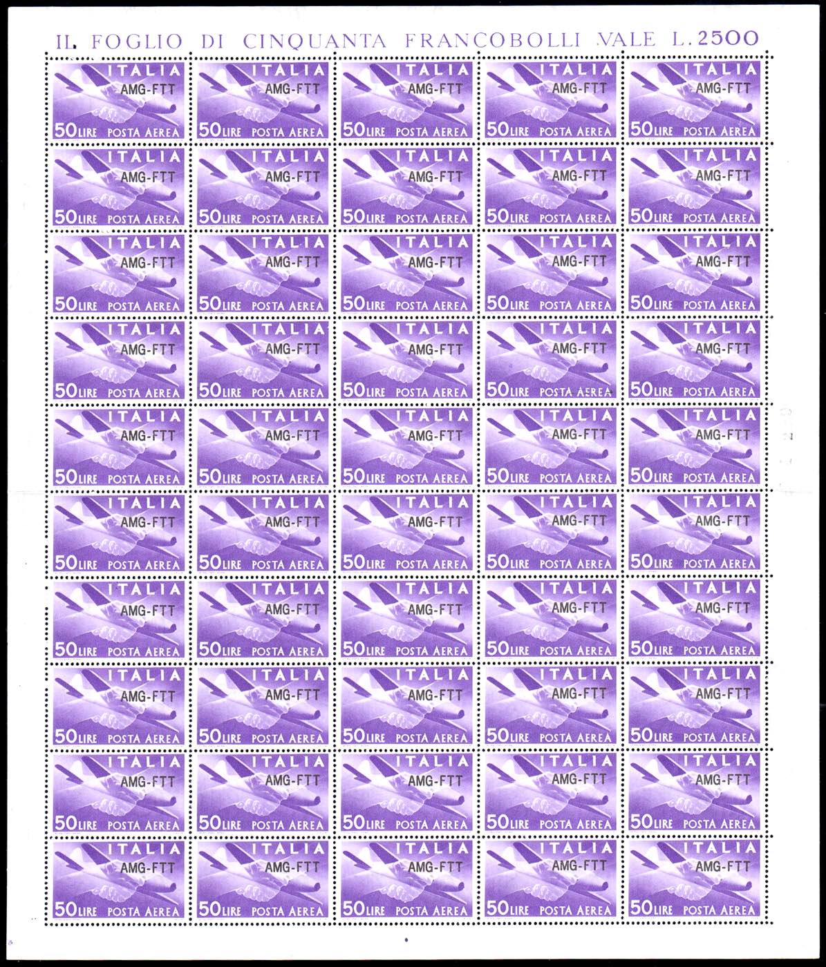 POSTA AEREA 1954 - 50 lire, nuovo tipo di soprastampa (22A), foglio completo di 50 esemplari, ottima centratura, gomma originale integra, perfetto. Raro e di ottima qualità. Cert. Cilio.