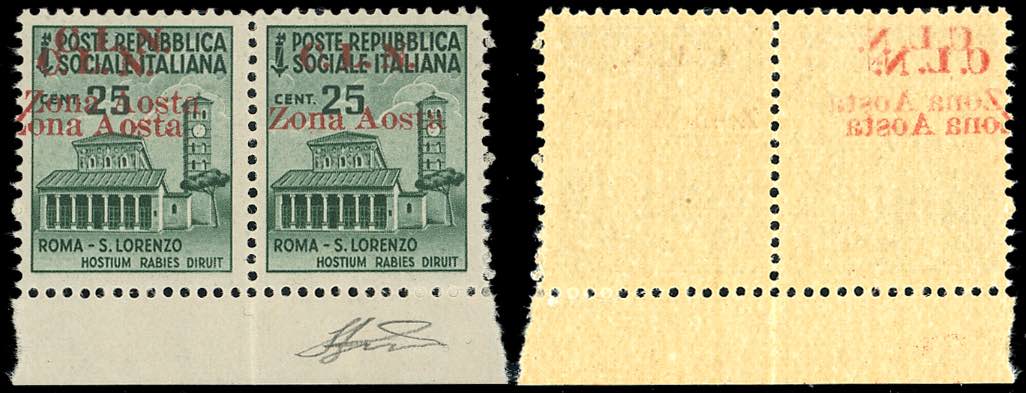 AOSTA 1944 - 25 cent., coppia orizzontale, il primo esemplare con doppia soprastampa (1ab), decalco al verso, gomma integra, perfetta. ... Read more