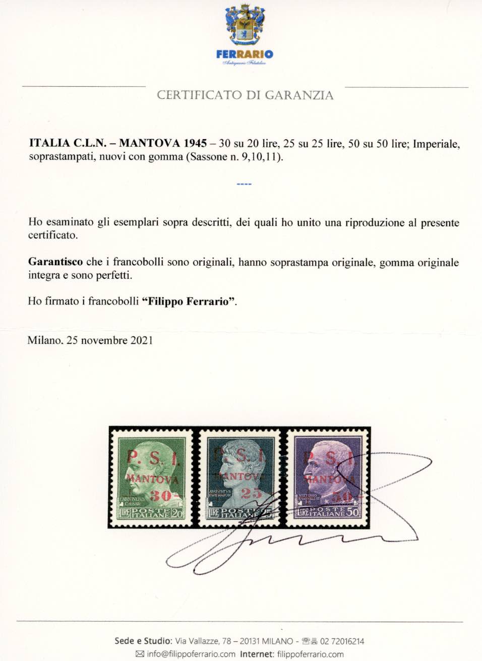 MANTOVA 1945 - Soprastampati, serie completa (1/11), gomma originale integra, perfetti e ben centrati. Molto belli e rari. Alti valori cert. Ferrario.