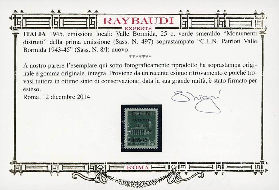 VALLE BORMIDA 1945 - 25 cent. Monumenti distrutti, I emissione, soprastampato (8/I), gomma originale integra, perfetto. Molto raro. Cert. ... Read more